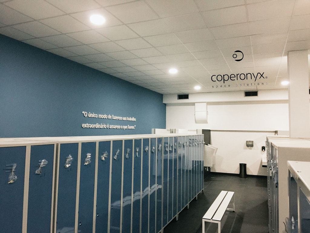 Neste projeto houve o cuidado na escolha dos materiais de acabamento, como seja aplicação de materiais resistentes à água, aplicação de piso antiderrapante, e a escolha de uma decoração apoiada na cor, desde logo a personalização da cor dos cacifos, bem como um apontamento de cor efetuado na parede principal do espaço, onde foi colocada uma mensagem motivadora para os trabalhadores.