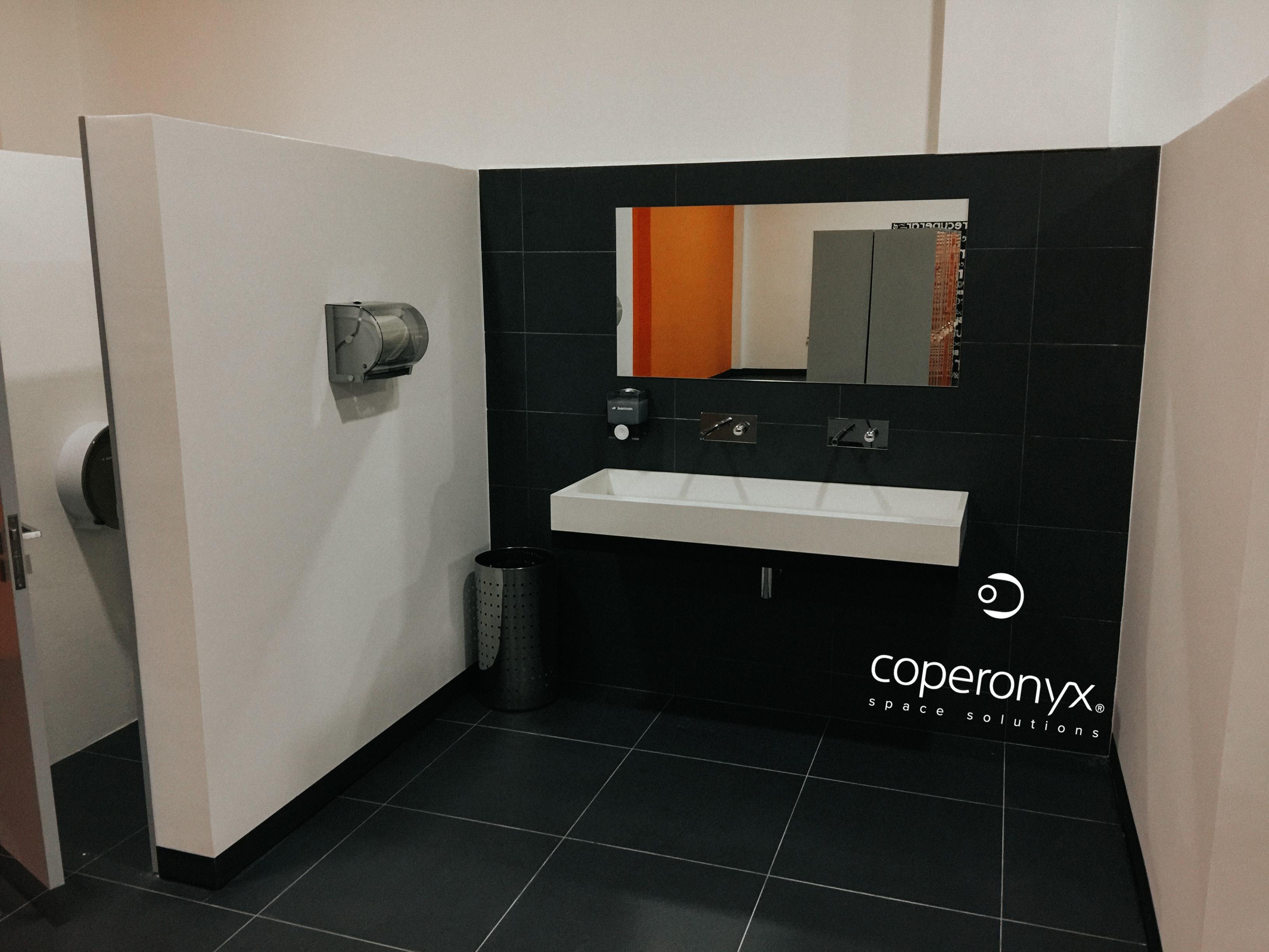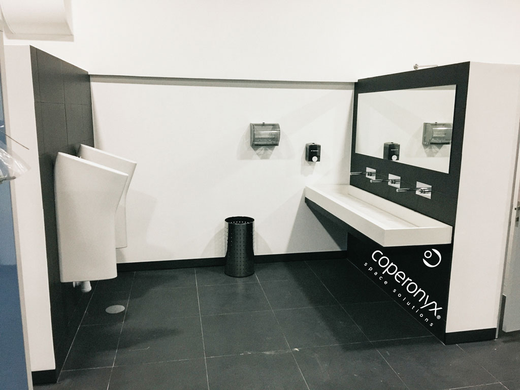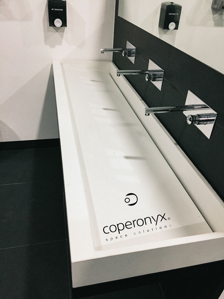 Neste projeto, algumas peças, como os lavatórios em pedra de quartzo branco, os bancos de apoio e a mensagem motivadora, foram desenhadas pela COPERONYX®.