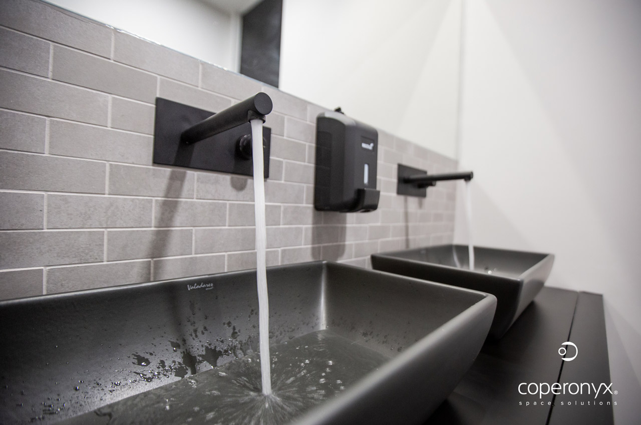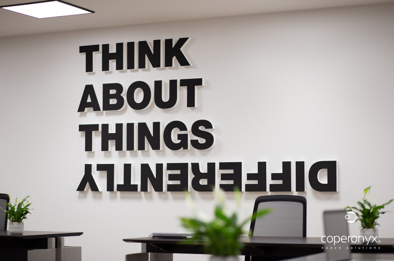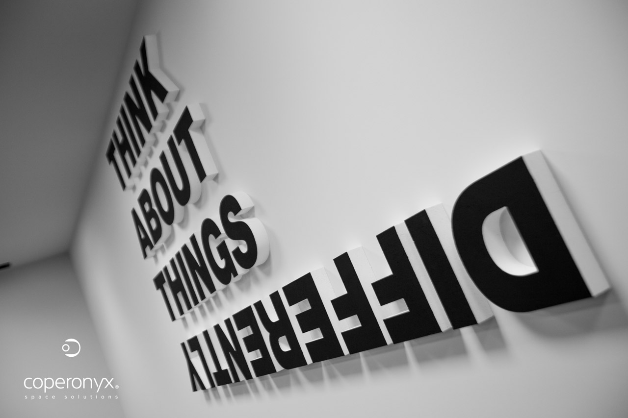 Contrastando fortemente com as linhas do espaço, o lettering inspiracional, além de apontamento decorativo, transmite uma mensagem impactante para os utilizadores do espaço.