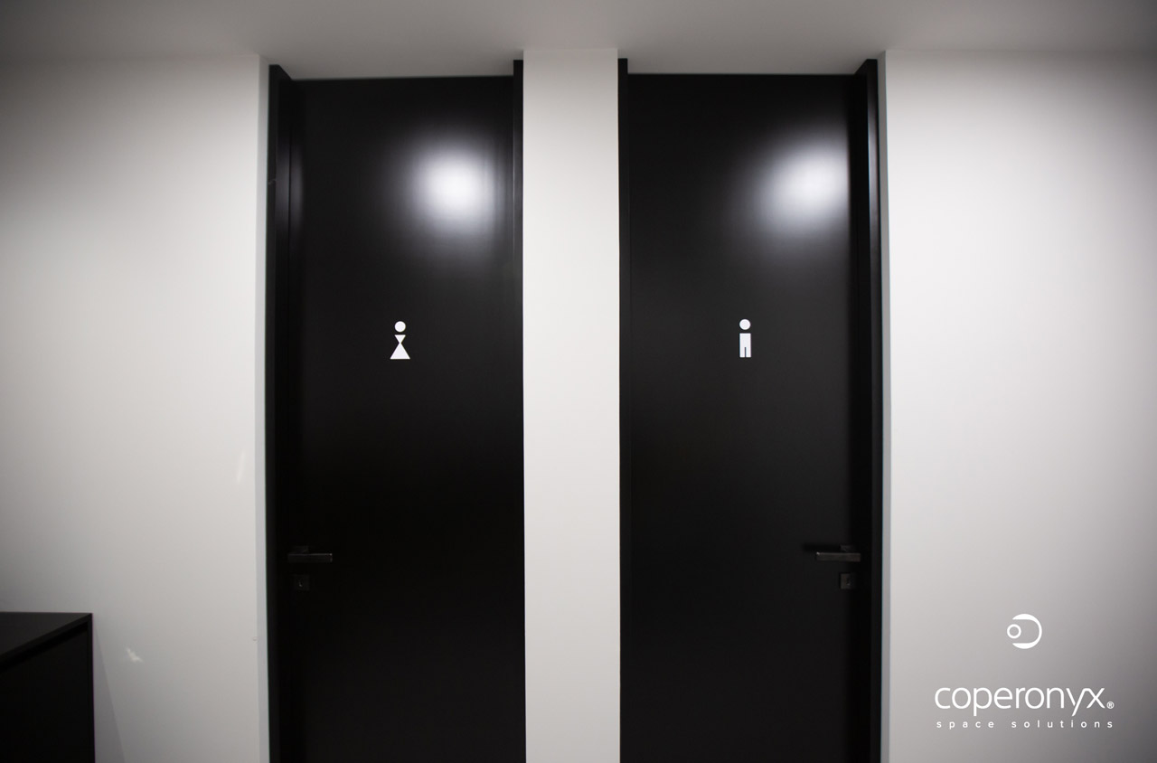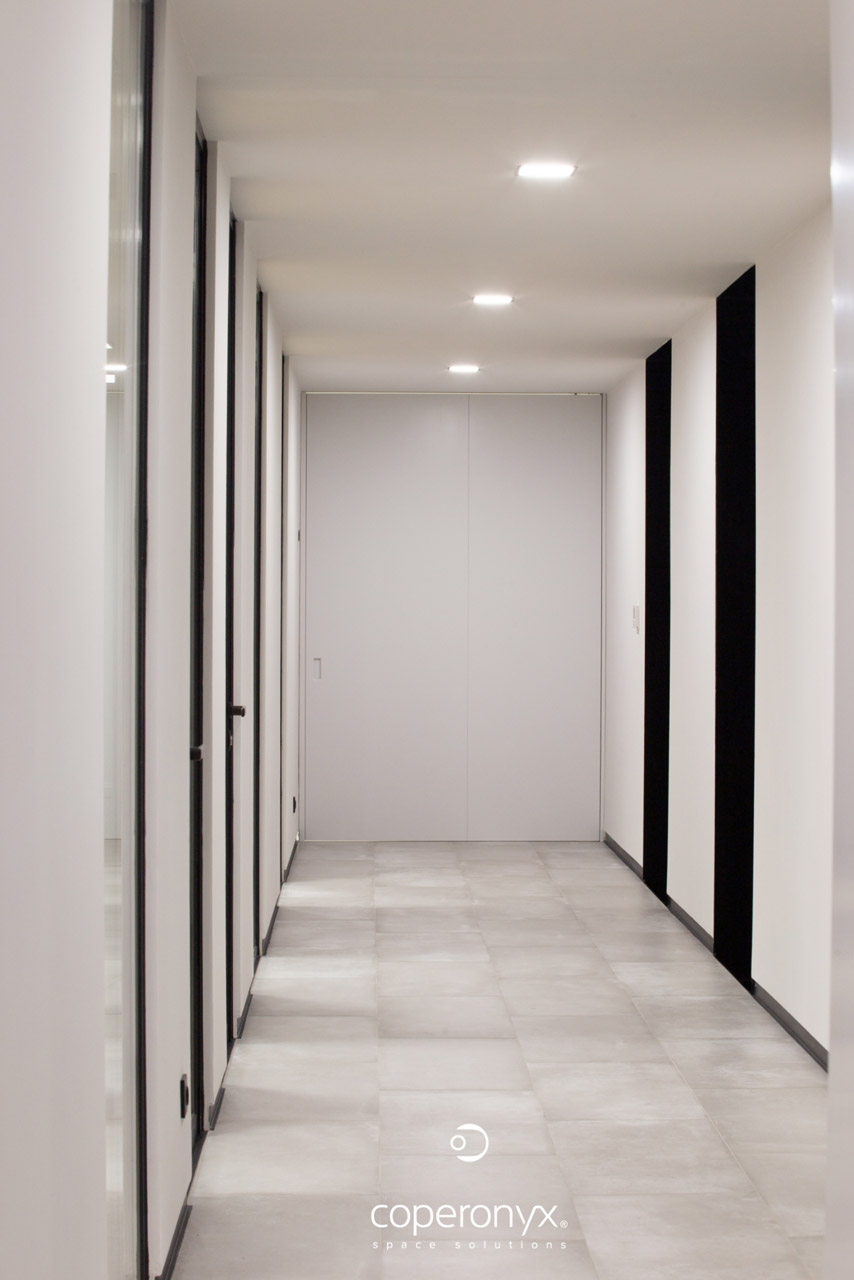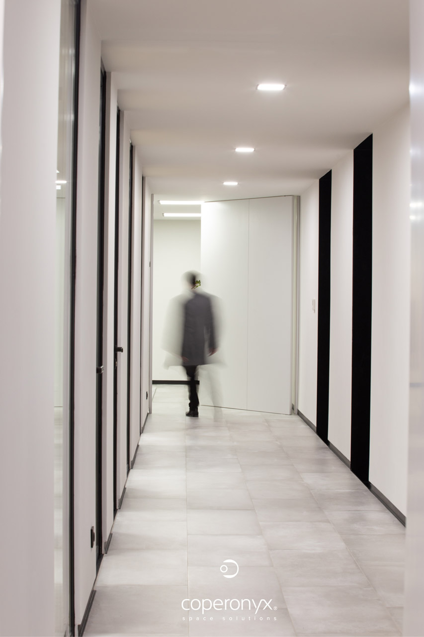 Na zona de trabalho, num conjunto marcadamente out-of-the-box, as cores monocromáticas distinguem claramente a funcionalidade do espaço, apenas rompida pelas cores dos elementos naturais, como o pavimento na zona dos gabinetes e as plantas de interior.
